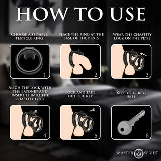 Le système de verrouillage, simple et intuitif, transforme l’acte de fermer la cage en un rituel chargé de tension. Une fois la clé retirée et conservée hors de portée, la dynamique de pouvoir s’installe naturellement. Les quatre anneaux interchangeables, aux diamètres internes d’environ 4 cm, 4,3 cm, 4,8 cm et 5 cm, permettent d’ajuster précisément le maintien autour du sexe et des testicules, assurant un équilibre entre sécurité et confort, même lors d’un port prolongé.