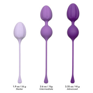 The 3-piece set includes a 55 g, 75 g, and 95 g and a full workout routine.