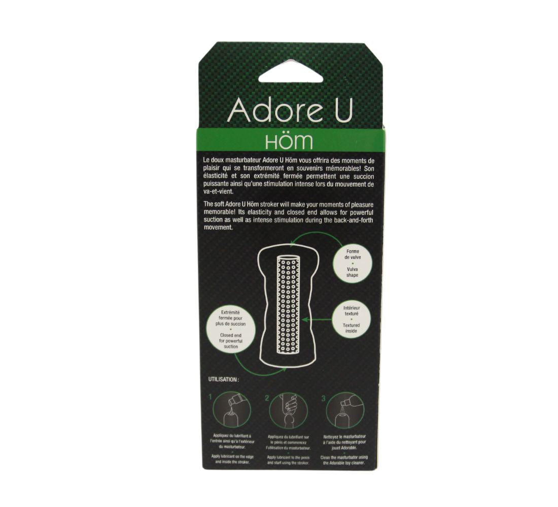 Le masturbateur souple Adore U Höm rendra vos moments de plaisir inoubliables ! Son élasticité permet une stimulation intense lors des mouvements de va-et-vient. 3 étapes faciles : 1. Versez le lubrifiant à l’entrée du masturbateur et à l’intérieur du manchon. 2. Appliquez du lubrifiant sur vous-même et insérez le masturbateur. 3. Une fois terminé, nettoyez le masturbateur avec le nettoyant Adorable.