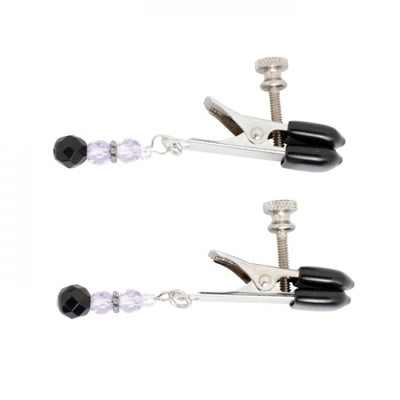 Pinces à tétons réglables à large extrémité avec perles violettes. Embouts en caoutchouc souple. Ajustez les pinces en tournant la vis moletée : d’un simple ornement délicat à une stimulation assez intense. Vendues par paire.