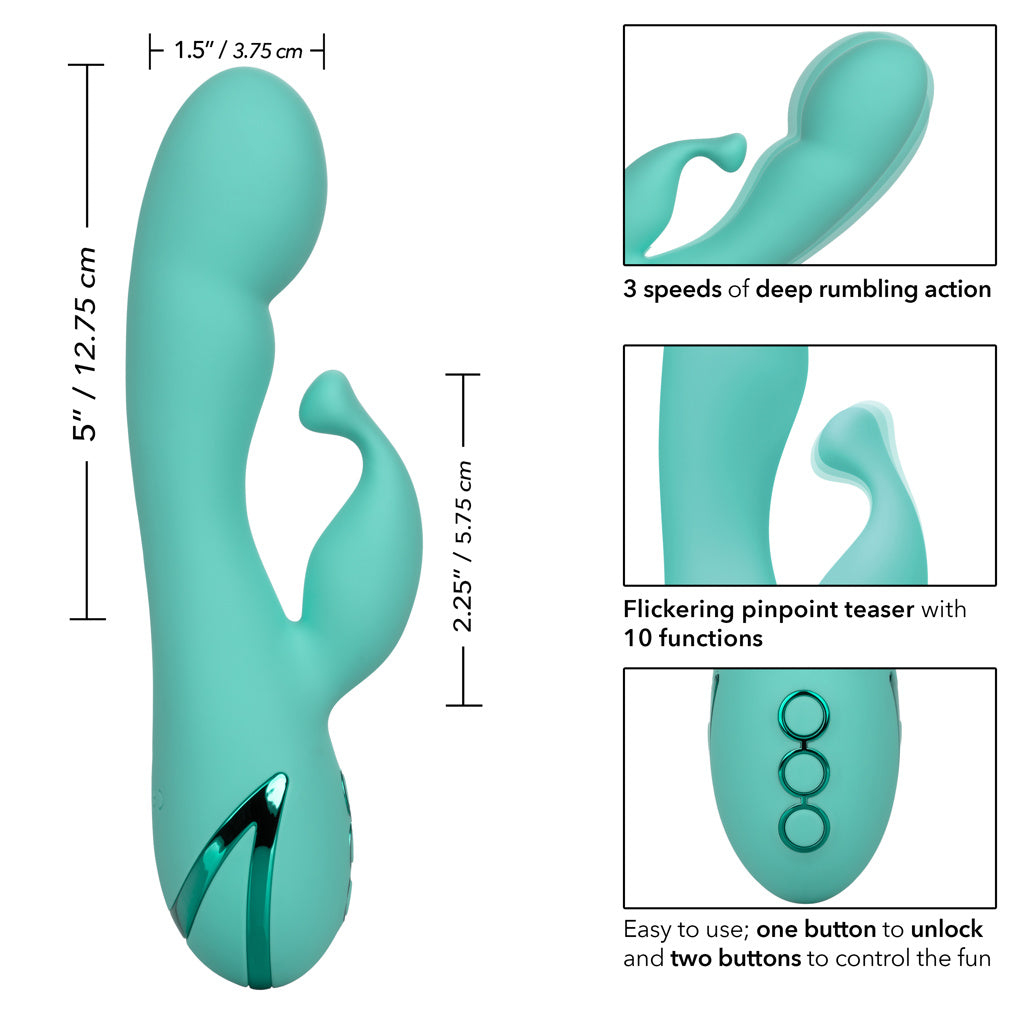 Ce vibromasseur à double vibration offre des vibrations profondes à la tête et au corps, et son stimulateur externe intégré vous garantit un plaisir intense. Ce puissant masseur vibrant est doté d'un stimulateur précis conçu pour cibler toutes vos zones érogènes et vous procurer exactement le plaisir que vous recherchez. Avec ses 3 vitesses de vibrations profondes et son corps sensuellement incurvé, ce sextoy vous promet des moments inoubliables. Ses 10 fonctions supplémentaires (vibration indépendante, pulsation et intensification) vous aideront à atteindre un bien-être sexuel optimal. Sa puce mémoire de pointe reprend automatiquement la dernière fonction utilisée, et le verrouillage automatique pour les voyages vous assure que l'appareil est allumé uniquement lorsque vous le souhaitez. Ce masseur peut être utilisé seul ou à deux, et son silicone hypoallergénique vous permettra de vous déconnecter complètement. Un câble de recharge USB est inclus et permet une recharge complète en seulement 2,5 heures. Avec une autonomie de 40 minutes en mode haute puissance et de 2,5 heures en mode basse puissance, vous pouvez être certain que ce jouet est toujours prêt à fonctionner, encore et encore...