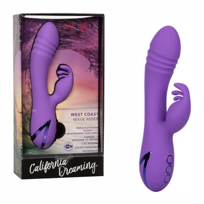 Libérez le mouvement de l'océan avec le California Dreaming West Coast Wave Rider. Ce magnifique sextoy couleur océan est fabriqué en silicone hypoallergénique et, vous l'aurez deviné, est entièrement étanche, pour une utilisation pratique partout. Son puissant masseur rotatif en forme de G intégré à la tête lui permet de localiser précisément les vagues idéales. Le triple stimulateur vibrant offre à ce vibromasseur exceptionnel une expérience intense et personnalisée. Avec trois vitesses de rotation en forme de G et 10 modes de vibration, pulsation et intensification indépendants intégrés au stimulateur, vous ressentirez toujours votre partenaire idéal en pleine action. Grâce à ses nombreux réglages, vous apprécierez également sa puce mémoire de pointe qui reprendra l'utilisation exactement là où vous l'aviez laissée. Envie d'aventure ? Le système à deux boutons (un pour le stimulateur, l'autre pour la tige) est simple d'utilisation et permet de sélectionner rapidement vos préférences. Le verrouillage de voyage marche/arrêt à un bouton inclut un maintien de 3 secondes, vous permettant de voyager sans craindre les bruits parasites dans vos bagages. Ce vibromasseur rechargeable par USB est fourni avec son câble de chargement et se recharge complètement en seulement 2,5 heures. Offrant 40 minutes d'autonomie à haute vitesse et 2,5 heures à basse vitesse, ce masseur de bien-être sexuel est conçu pour vous garantir un plaisir intense à chaque fois.
