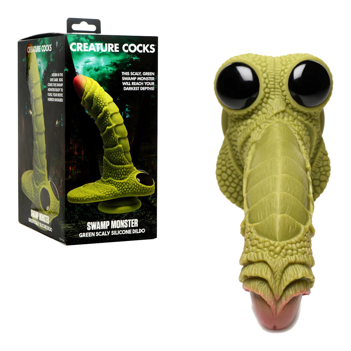 Plongez au cœur de nouveaux fantasmes avec ce gode Swamp Monster de Creature Cocks ! Son corps mystérieux est texturé de minuscules bosses et de crêtes écailleuses. Sa longue tige présente une douce courbe pour un plaisir pénétrant optimal et un gland rose tendre qui s'épanouit comme un bourgeon au bout d'une tige verte. À sa base se trouve un large plateau plat sur lequel vous pouvez vous appuyer, ainsi que deux sphères en verre noir brillant qui semblent vous observer de l'intérieur lorsque vous le chevauchez !