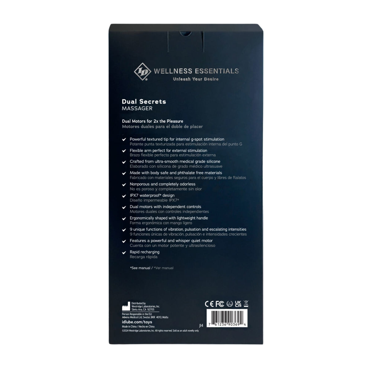 Laissez-vous séduire par le vibromasseur Dual Secrets, conçu pour offrir une stimulation interne et externe inédite grâce à ses deux moteurs puissants, chacun doté de commandes indépendantes. Avec 9 modes de vibration, pulsations et intensités croissantes, ce vibromasseur vous permet de personnaliser chaque instant pour un plaisir incomparable.