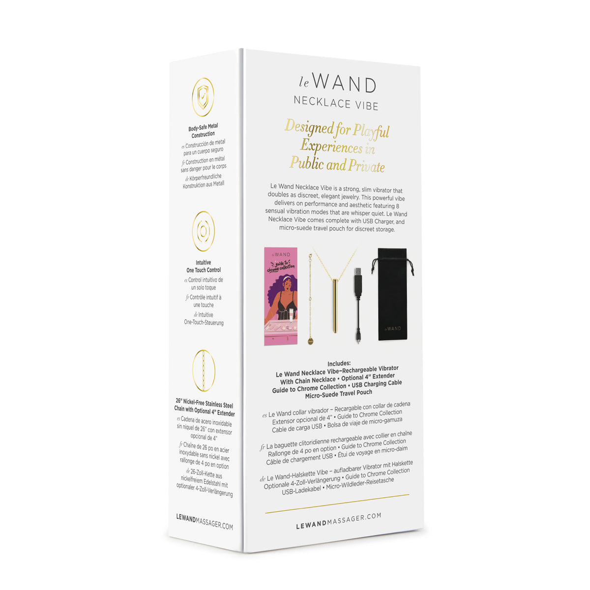 Doté d'une chaîne en acier inoxydable sans nickel de 66 cm avec une rallonge optionnelle de 10 cm, le collier Le Wand Vibe est livré avec un chargeur USB et une pochette de voyage en micro-suède pour des aventures discrètes.