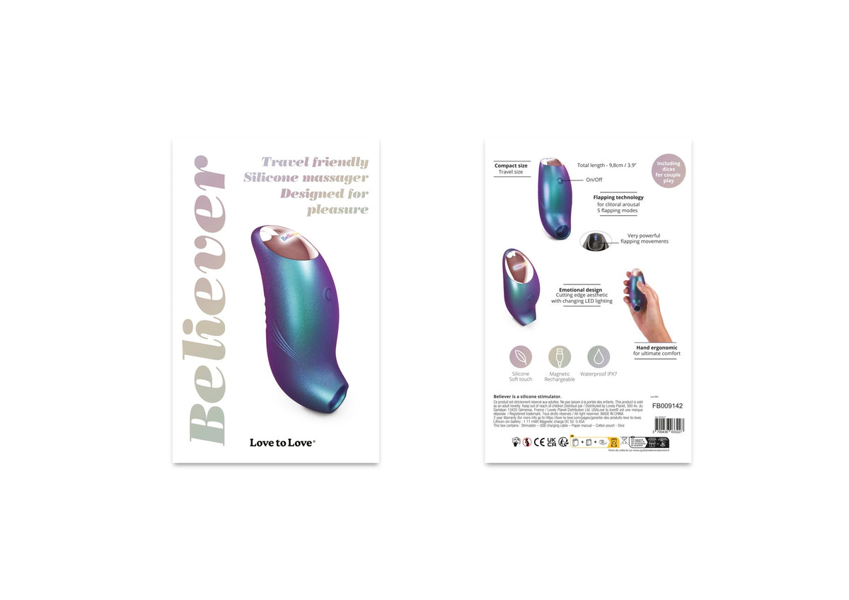 Avec 3 types de mouvements et 5 niveaux d'intensité, Believer s'adapte à toutes vos envies. Que vous recherchiez une expérience délicate ou des sensations plus intenses, il répond à vos attentes en toute discrétion, même dans l'obscurité grâce à son écran rétroéclairé. Et pour les amateurs de plaisirs aquatiques, Believer est entièrement étanche : plongez sans hésiter !