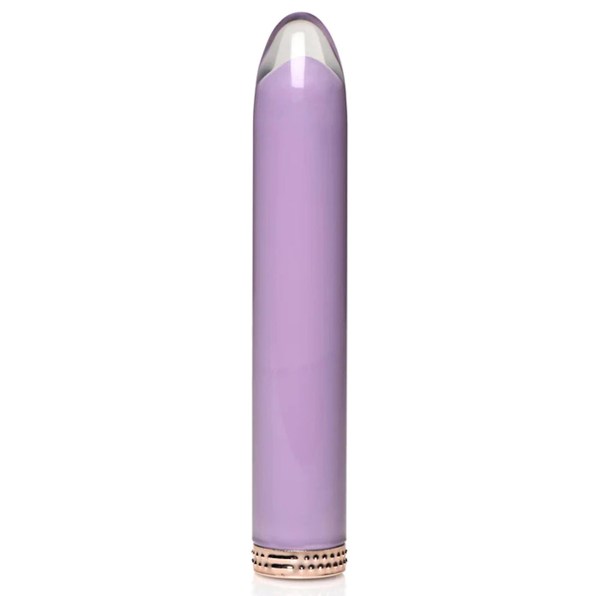 Avec ce vibromasseur élégant en verre, vous atteindrez des sensations inoubliables ! Sa couleur violette unique, son extrémité légèrement pointue et arrondie, et son anneau doré à la base lui confèrent élégance et sensualité. Ce vibromasseur long et résistant en verre borosilicate est non poreux et compatible avec tous les types de lubrifiants.