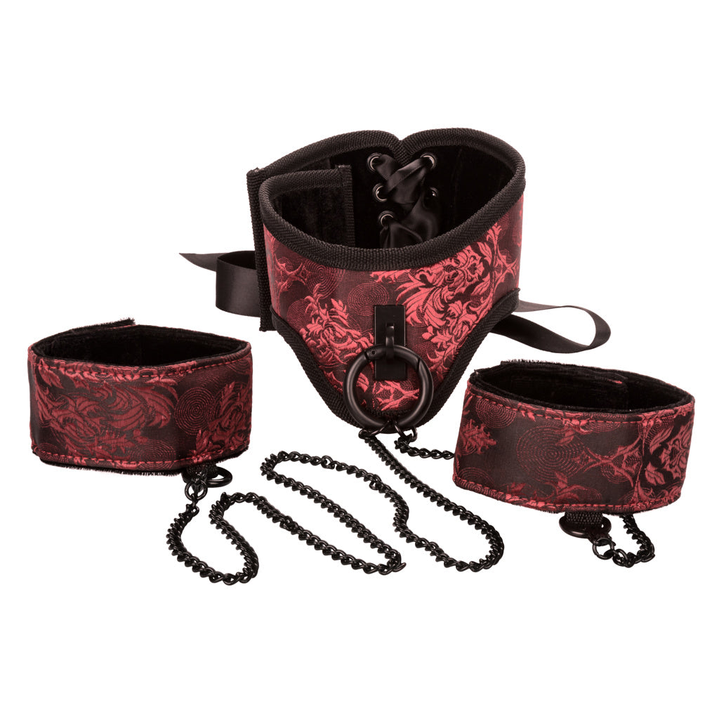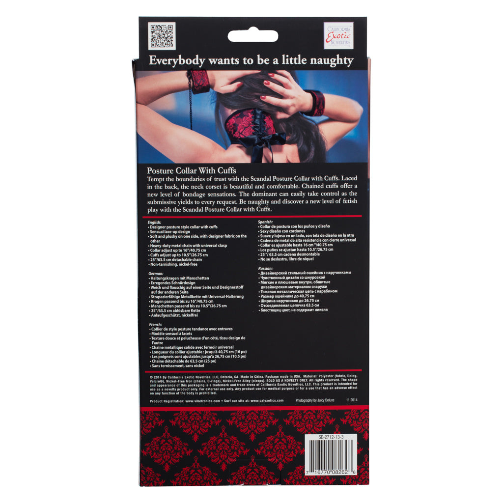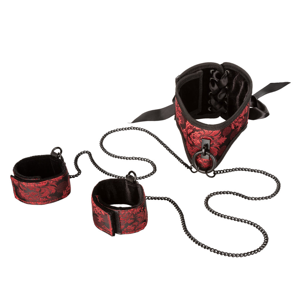 Abandonnez-vous à votre amant et parez-vous de ce luxueux collier de posture à lacets en brocart rouge et noir. Inspiré d'un corset, ce collier sensuel est parfaitement flatteur. Son intérieur moelleux et doublement rembourré offre un confort suprême à la soumise tandis que le dominant la lèche, l'embrasse, la caresse, ou même la fesse jusqu'à l'extase. Si vous avez envie de garder un petit secret coquin, détachez les chaînes pour porter le collier et les menottes comme accessoires de mode. Doux et ultra-rembourrés d'un côté, ils sont confectionnés dans un tissu de créateur séduisant de l'autre, parfaits pour des jeux érotiques et comme accessoires uniques. Les robustes chaînes métalliques pendantes vous procureront une sensation intense en vous maintenant fermement en place, à la merci des désirs de votre amant. Ou prenez le contrôle et attachez les poignets et les chevilles de votre partenaire à son cou fermement ligoté, aux montants du lit, ou partout où votre imagination vous mène. Le laçage sensuel permet au collier d'enserrer votre cou avec la fermeté qui vous excite, tandis que la flexibilité des menottes entièrement détachables offre une expérience de jeu véritablement personnalisée. Chatouillez, taquinez et excitez votre partenaire à votre guise tout en vous délectant de la vue de son corps ligoté et soumis. Prenez les rênes et enlacez le cou de votre partenaire dans ce magnifique collier, une boucle à couper le souffle après l'autre. Les possibilités sont infinies, alors enroulez-les autour des poignets de votre partenaire et laissez vos fantasmes prendre vie.