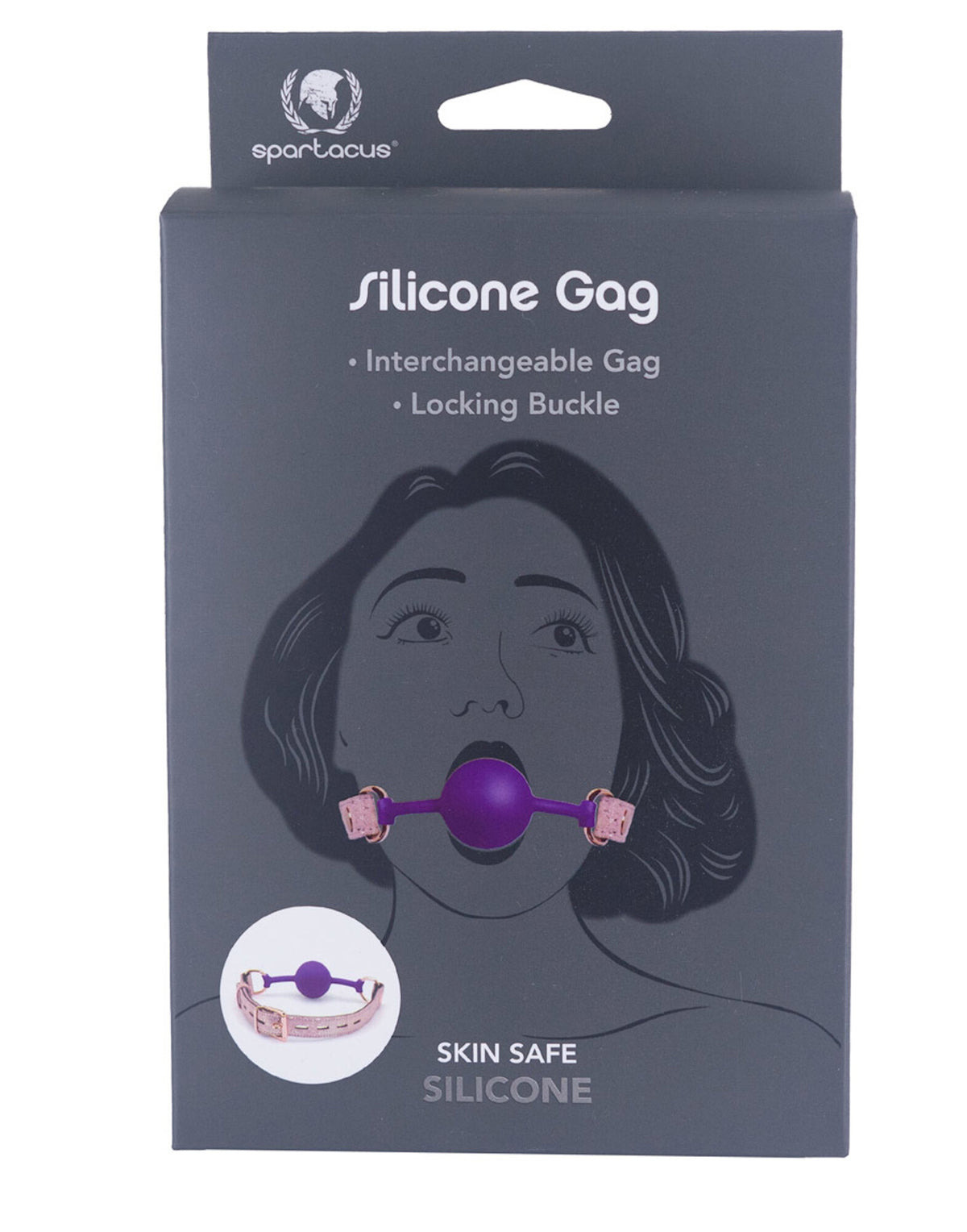 Bâillon boule en silicone violet avec sangle en microfibre à imprimé serpent rose, doublure en cuir 1,85 po / 47 mm.
