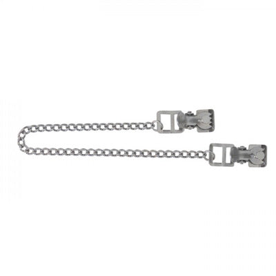 Pinces à tétons ajustables à pointes dentelées. Les dents de ces pinces en métal nu sont très mordantes ! Une chaînette ajoute du poids. Âmes sensibles s'abstenir !