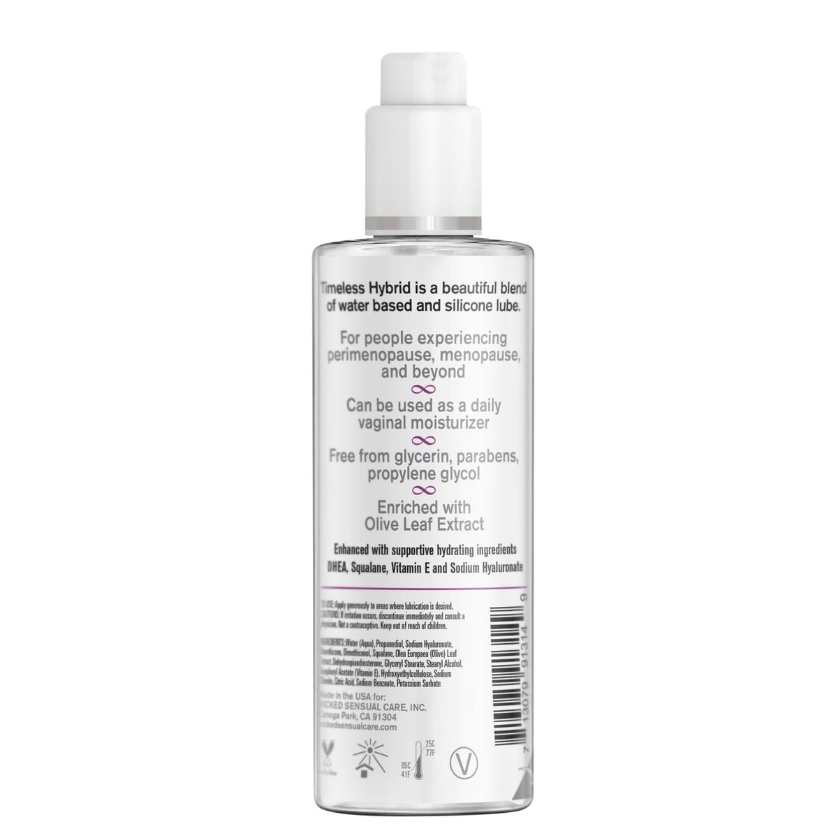 Chaque lubrifiant contient des ingrédients bienfaisants comme l'aloe vera, l'extrait de feuille d'olivier, le squalane et la vitamine E. Ce sont ces ingrédients qui le distinguent des autres produits de la gamme Simply. Comme tous les produits Simply, les formules Timeless sont sans glycérine, sans parabènes et sans propylène glycol. Peut également être utilisé comme hydratant vaginal quotidien.